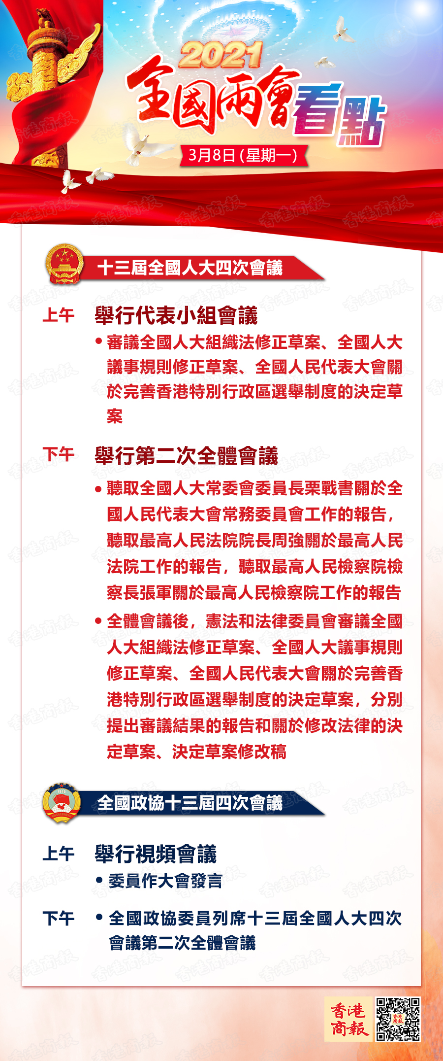 一圖知曉丨3月8日兩會看點:最高法最高檢作工作報告