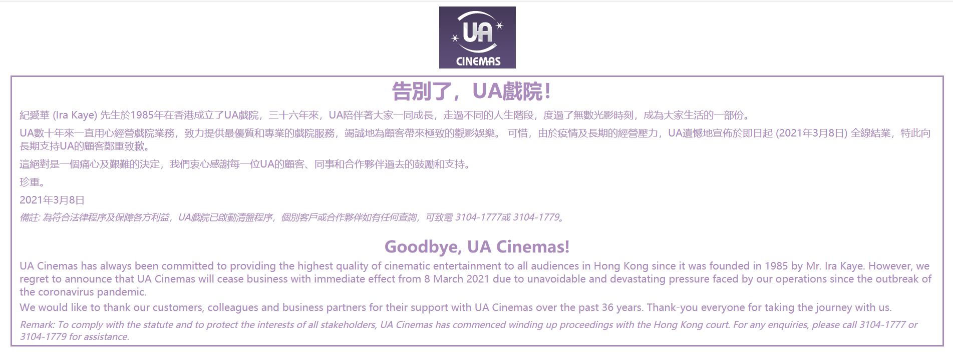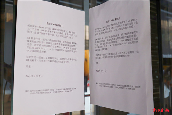 8日,本地院線UA Cinemas(娛藝)宣布,因應疫情及長期的經營壓力即日起(3月8日)全線結業,並表示目前已啟動清盤程序,向顧客致歉。不過,戲院發布告示內文並無提到會如何處理會籍和禮券等事宜。