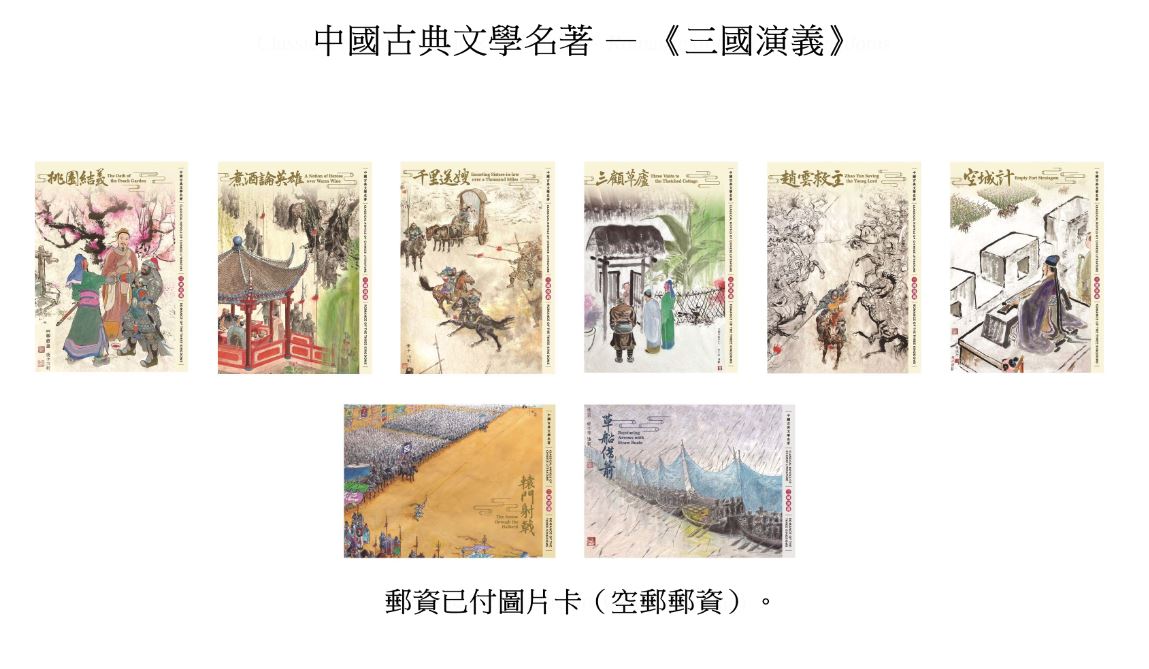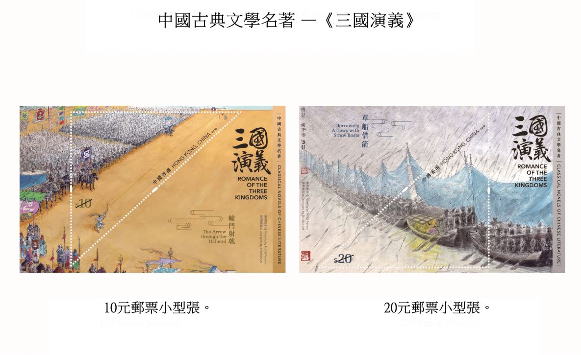 香港郵政透露,16日會發行一套6枚郵票及2款郵票小型張,它們以《三國演義》中8個家喻戶曉的場景作郵票設計,包括桃園結義、煮酒論英雄、千里送嫂、三顧草廬、趙雲救主、空城計、轅門射戟及草船借箭;郵政指為使兩款郵票小型張之場景更顯動感,小型張上的郵票會特別設計成三角形,別具收藏價值。