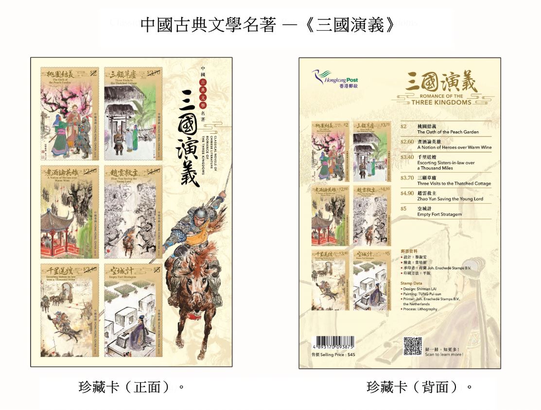 香港郵政表示,將於16日發行以「中國古典文學名著—《三國演義》」為題的特別郵票及相關集郵品,而郵票更以著名畫家董培新的畫作設計,讓市民於方寸之間細賞這部名著。