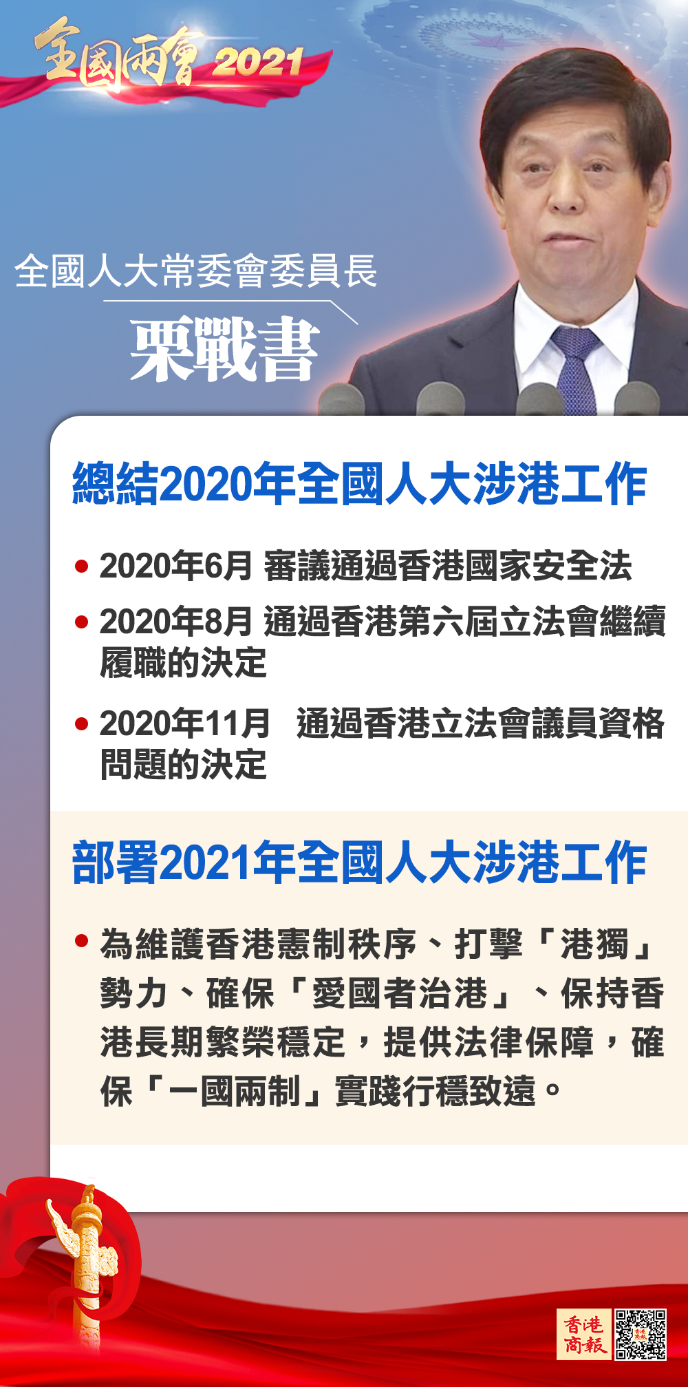 栗戰書強調,全國人大將堅定不移依法維護國家主權、安全、發展利益,為維護香港憲制秩序、打擊「港獨」勢力、確保「愛國者治港」、保持香港長期繁榮穩定,提供法律保障。
