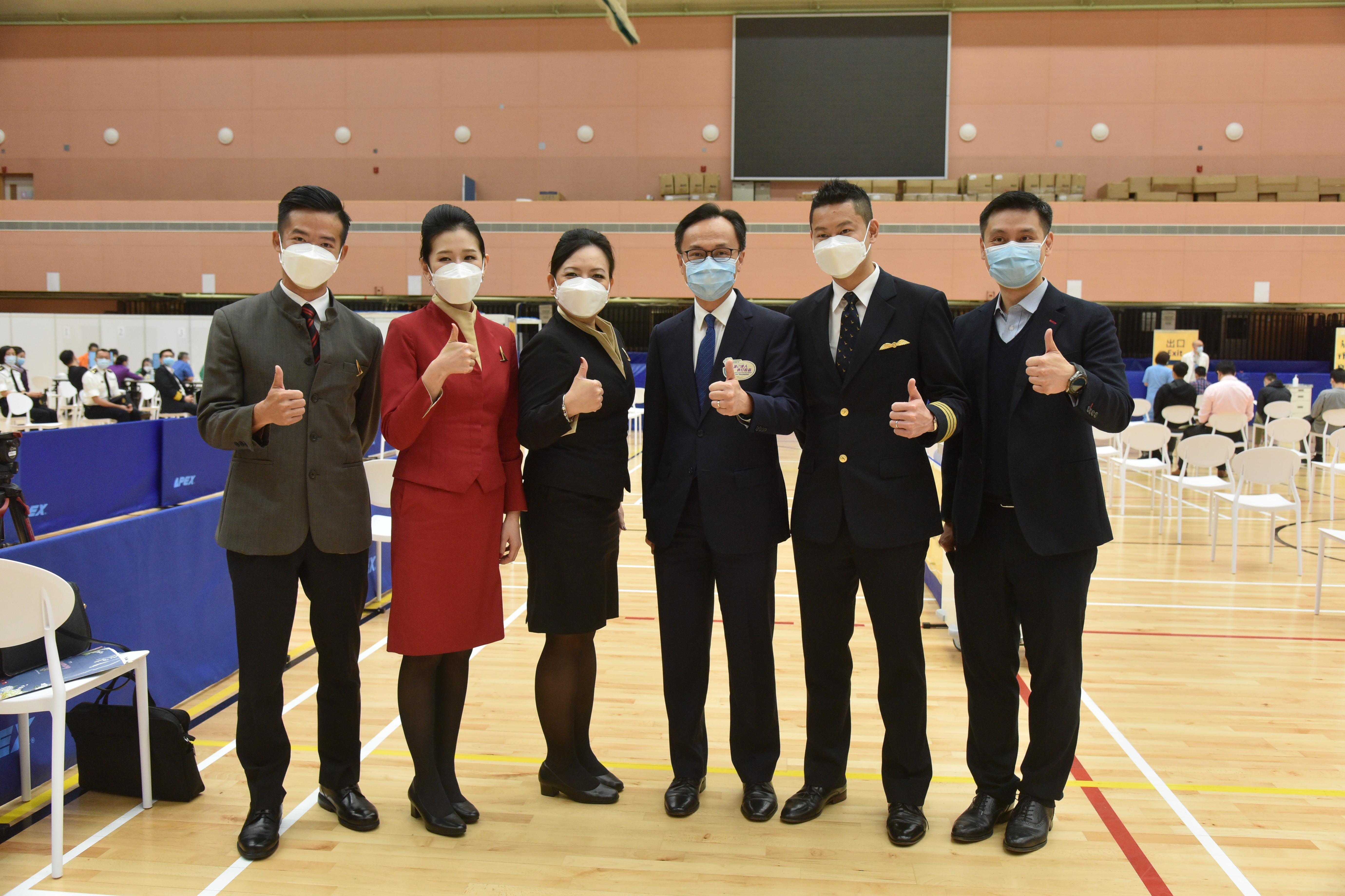 公務員事務局局長聶德權到場視察,並與到場接種的機組人員合照。