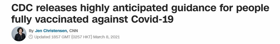據CNN報道,當地時間8日,美國疾控中心(CDC)向已打完新冠疫苗人士發出新指引,指他們可以在不戴口罩或不保持社交距離下,與其他已打完疫苗人士在室內聚會,亦可探訪對嚴重疾病低風險、但未接種疫苗的家庭;如果曾接觸無症狀感染者,亦無需隔離及檢測,但應監察身體情況14日。