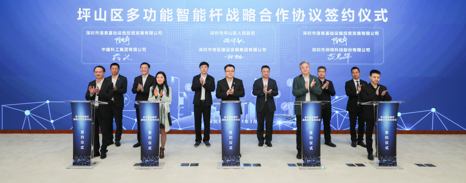 活動現場,坪山區政府與深圳市特建發集團簽訂多功能智能杆戰略合作框架協議,深圳市綜合交通科技有限公司、坪山信息基礎設施投資發展有限公司正式揭牌,坪山智能網聯全域開放融合信息基礎設施建設舉行了啟動儀式。