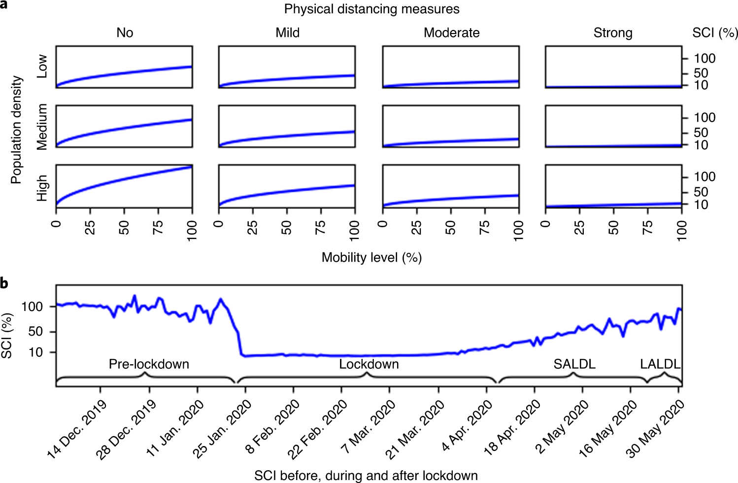 武漢市的社交接觸指數隨人口密度和社交距離不同而變化。