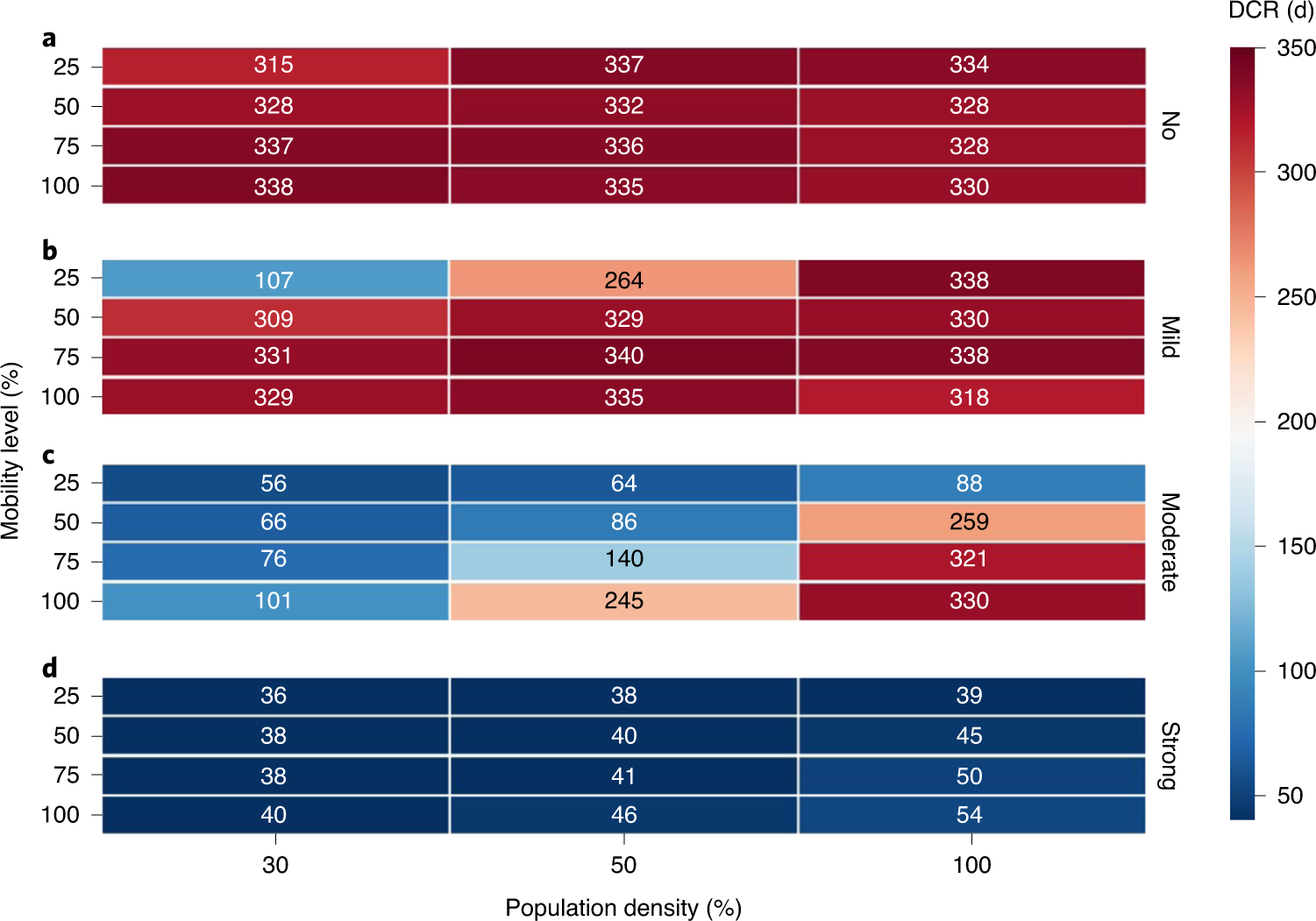 研究團隊假設達致群體免疫的1年內新冠肺炎疫苗接種率為64%,疫苗有效率為75%,在中等人口密度之城市,即約一半武漢市,接種疫苗可縮短36至78%實施社交距離措施的時間;對於人口稠密城市如武漢市,接種新冠肺炎疫苗可降低社交距離措施強度,並縮短新一波疫情持續時間及減少病例數目。