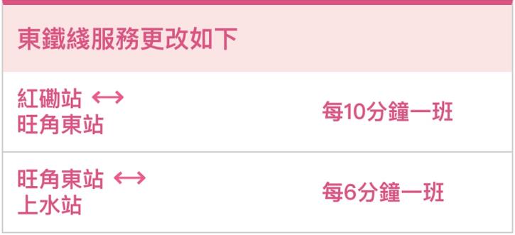 來往紅磡站至上水站的行車時間,預計需要額外10至15分鐘;紅磡站至旺角東站每10分鐘一班、旺角東站至上水站每6分鐘一班。港鐵呼籲乘客為行程預留充裕時間。