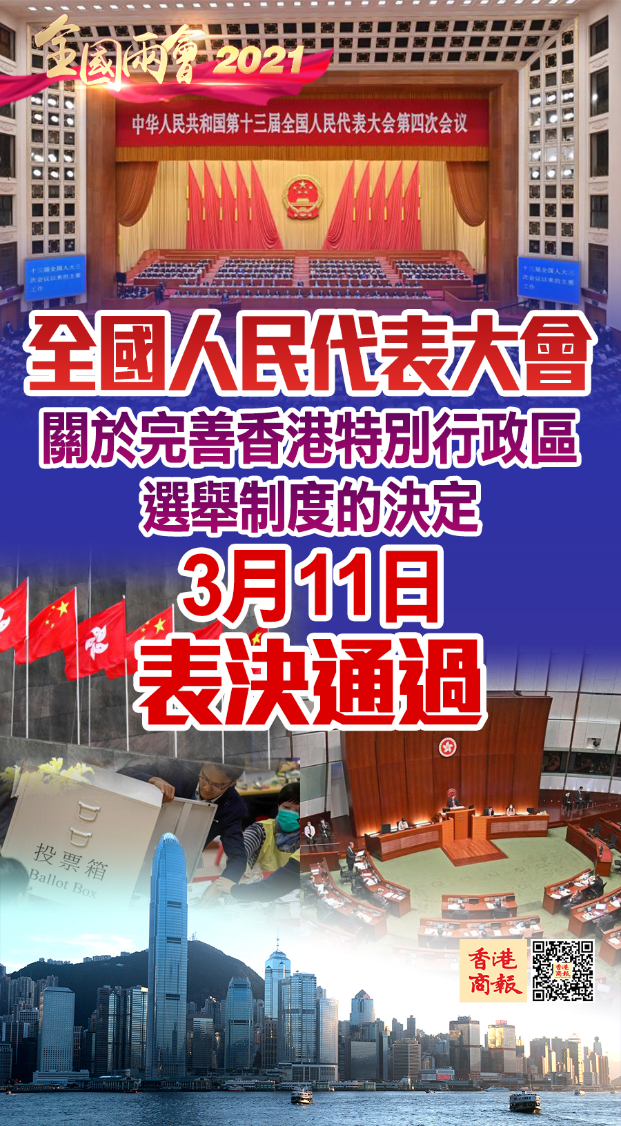 11日下午,人大會議以2895票贊成、0票反對、1票棄權,高票表決通過《全國人民代表大會關於完善香港特別行政區選舉制度的決定》。決定通過時,人民大會堂會場內響起經久不息的熱烈掌聲。這是繼制定實施香港國安法後,國家完善香港特區法律和政治體制的又一重大舉措。