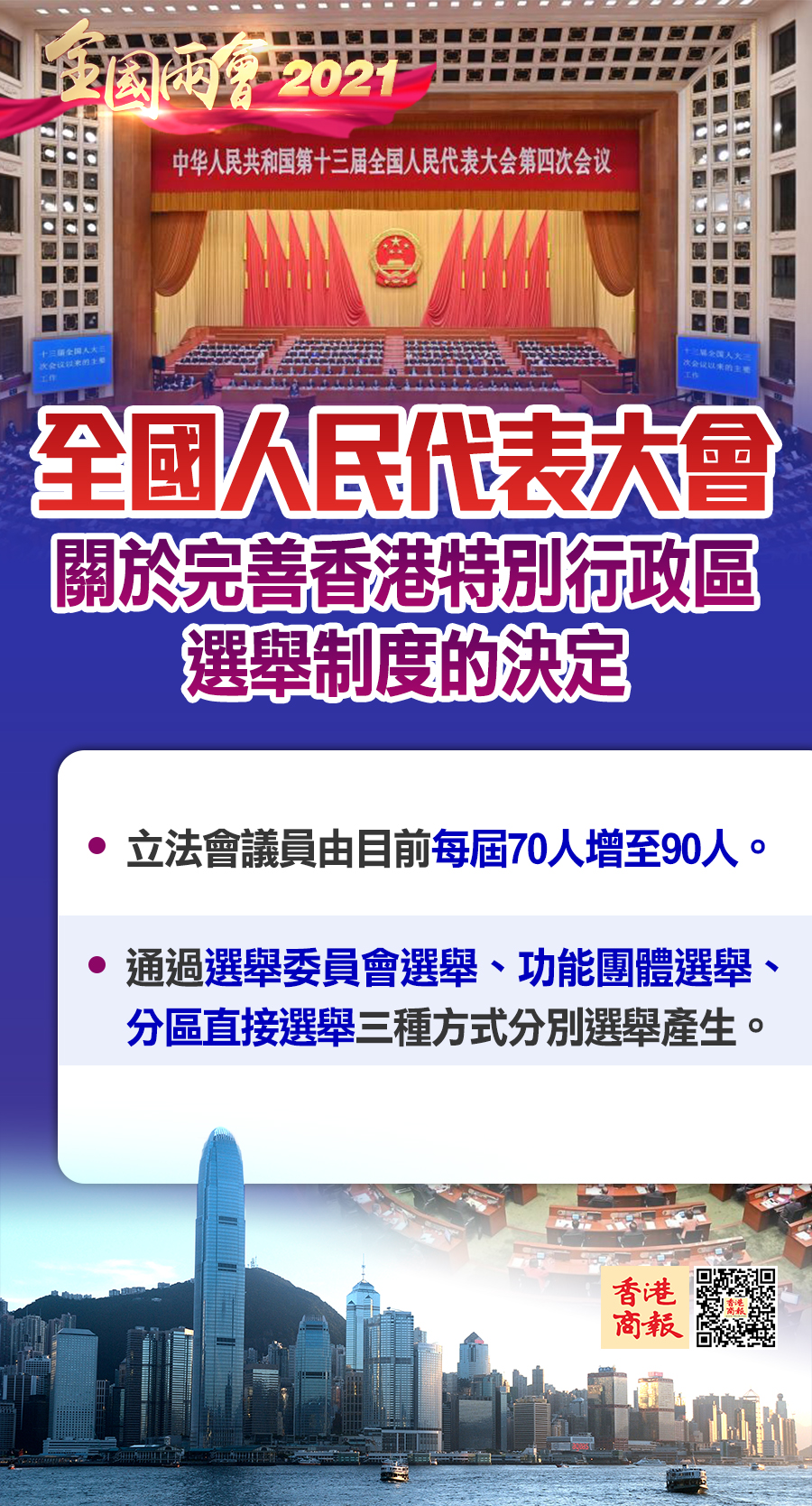 決定指出,十三屆全國人大四次會議審議了全國人民代表大會常務委員會關於提請審議《全國人民代表大會關於完善香港特別行政區選舉制度的決定(草案)》的議案。會議認為,香港回歸祖國後,重新納入國家治理體系,《中華人民共和國憲法》和《中華人民共和國香港特別行政區基本法》共同構成香港特別行政區的憲制基礎。香港特別行政區實行的選舉制度,包括行政長官和立法會的產生辦法,是香港特別行政區政治體制的重要組成部分,應當符合「一國兩制」方針,符合香港特別行政區實際情況,確保愛國愛港者治港,有利於維護國家主權、安全、發展利益,保持香港長期繁榮穩定。為完善香港特別行政區選舉制度,發展適合香港實際情況的民主制度,根據憲法第三十一條和第六十二條第二項、第十四項、第十六項的規定,以及香港基本法、香港國安法的有關規定,全國人民代表大會作出決定。