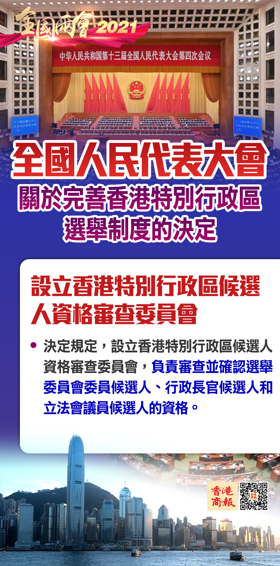 決定規定,設立香港特別行政區候選人資格審查委員會,負責審查並確認選舉委員會委員候選人、行政長官候選人和立法會議員候選人的資格。香港特別行政區應當健全和完善有關資格審查制度機制,確保候選人資格符合香港基本法、香港國安法、全國人大會常委會關於香港基本法第一百零四條的解釋和關於香港特別行政區立法會議員資格問題的決定以及香港特別行政區本地有關法律的規定。