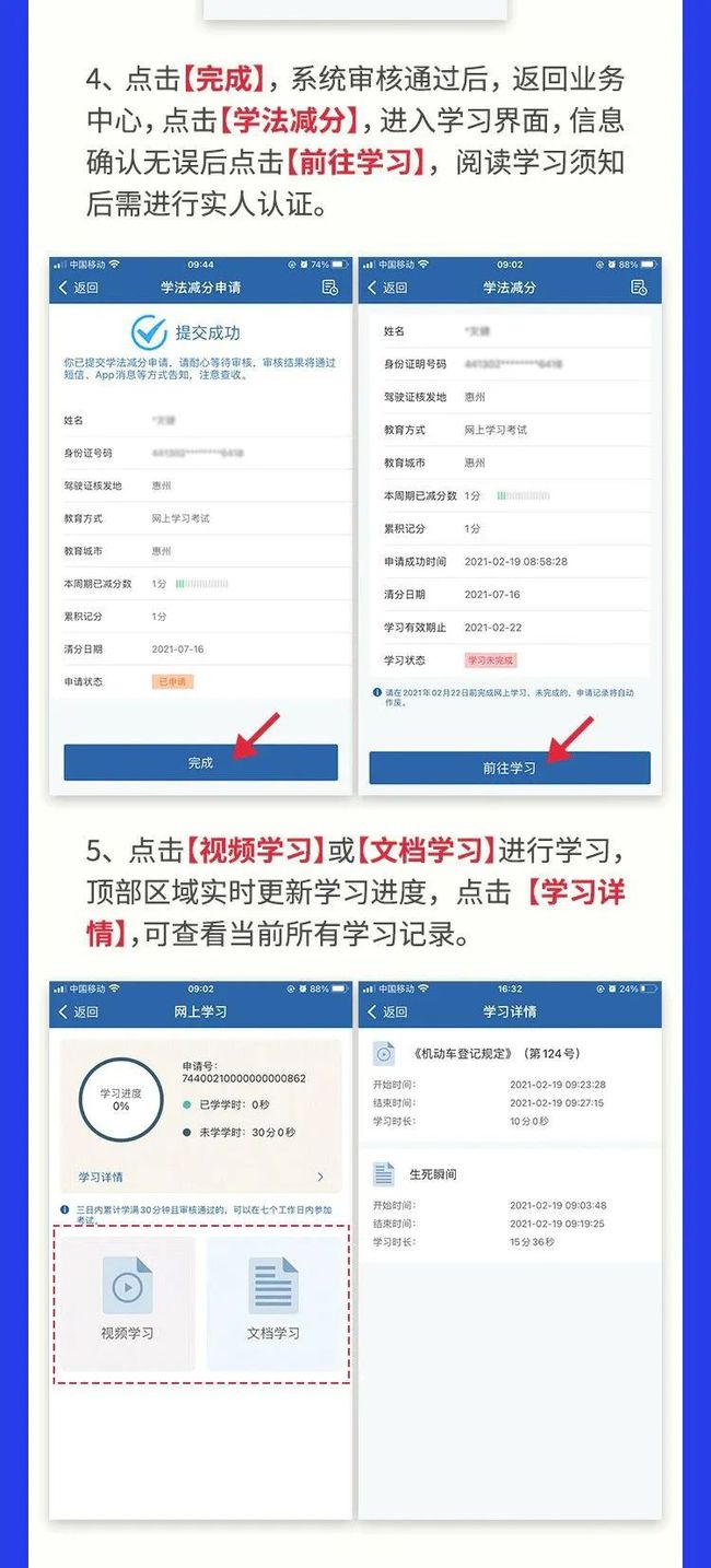 答:提交申請後,系統將自動核查申請人是否符合學法減分的申請條件,申請結果將於24小時之內通過App消息方式告知,請注意及時查看申請審核情況。申請成功之日起,申請人需在3日內完成累計30分鐘的交通安全知識學習(連續學滿5分鐘的,才計入累計學習時間),否則申請信息和學習紀錄自動作廢。
