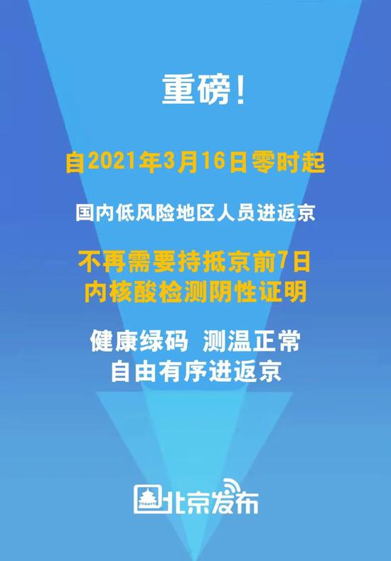 自2021年3月16日零時起,國內低風險地區人員進返京不再需要持抵京前7日內核酸檢測陰性證明,抵京後不再實行14天健康監測,滿7天、滿14天不再進行核酸檢測,持健康通行碼「綠碼」,在測溫正常且做好個人防護的前提下可自由有序進返京。