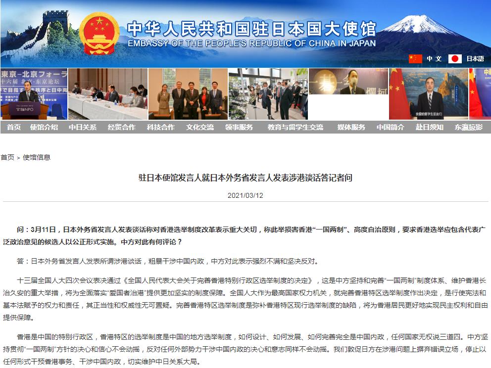 使館發言人斥日方粗暴干涉中國內政,強調香港特區的選舉制度是中國的地方選舉制度,如何設計、如何發展、如何完善完全是中國內政,任何國家無權說三道四。