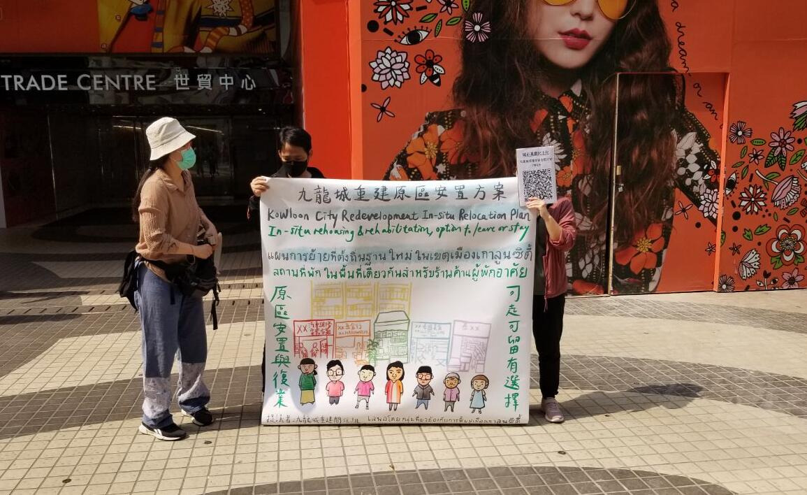 義工張小姐表示,曾就「九龍城重建原區安置方案」徵詢專業人士意見,地理學者兼市建局分區諮詢委員梁啟智認為方案可行性高,局方理應原區安置;香港中文大學城市研究課程主任伍美琴認為,好的城市規劃應注重街坊幸福感,而街坊方案是可以做到。