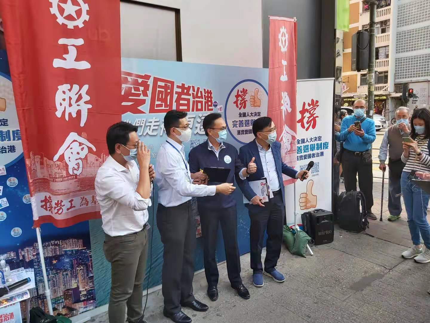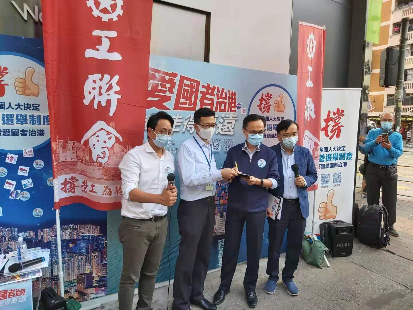 今天(12日)下午工記在工人俱樂部門口擺設旗艦站,會長吳秋北、理事長黃國、榮譽會長林淑儀及鄧家彪等到場,現場宣傳全國人大決定,呼籲市民簽名支持。公務員局局長聶德權到站參與簽名行動。