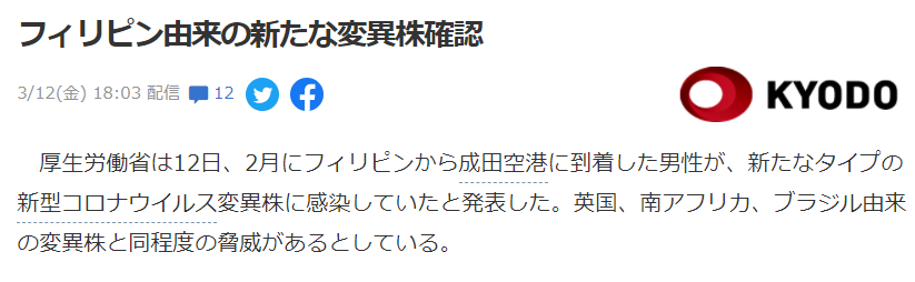 據日本共同社報道,日本厚生勞動省12日發布消息稱,2月從菲律賓抵達日本成田機場的一名60歲男性感染變異新冠病毒。