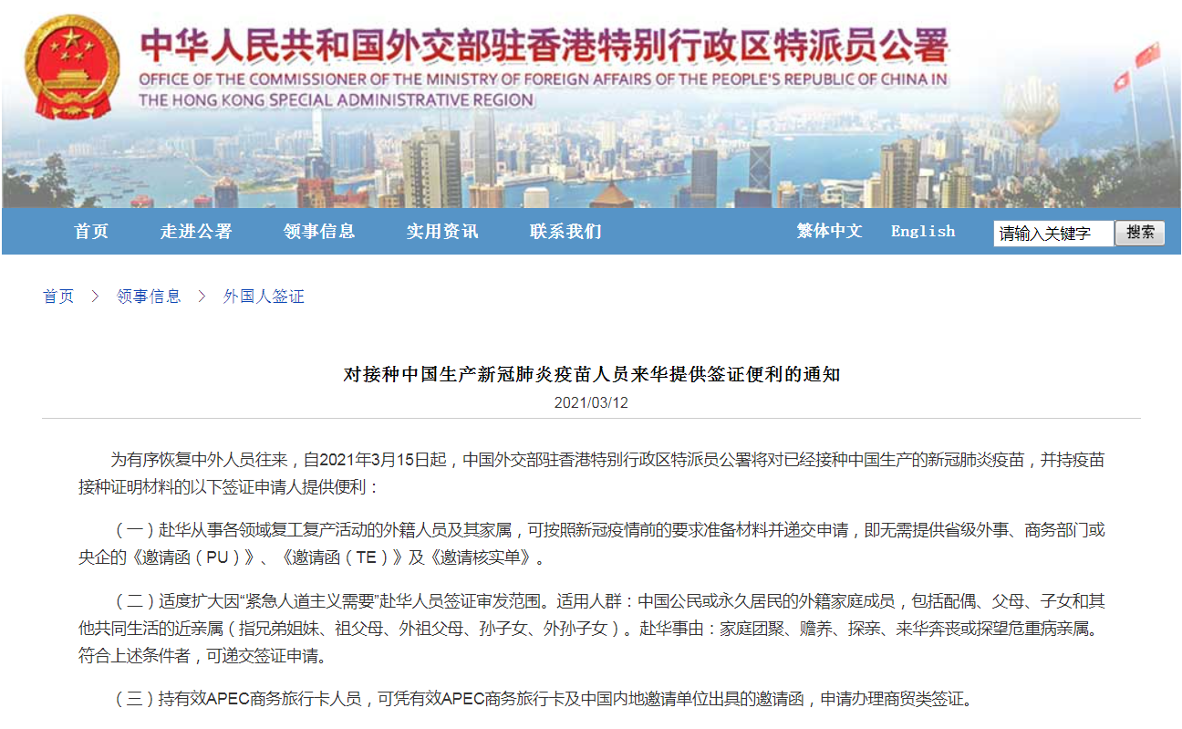 外交部駐港公署今日(12日)公布,為有序恢復中外人員往來,由下周一(15日)起,對已經接種中國生產的新冠疫苗,並持疫苗接種證明的簽證申請人提供便利,在遞交申請時不再需要提供核酸檢測陰性證明、過去14天旅行軌跡和健康申報表。受惠的對象包括,赴華從事各領域復工復產活動的外籍人員及家屬、因「緊急人道主義需要」赴華人員,或持有效APEC商務旅行卡人員。