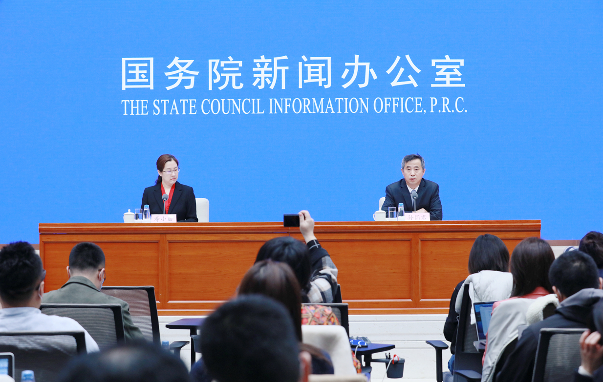 國務院新聞辦公室在北京舉行吹風會,國務院研究室黨組成員孫國君(右)解讀《政府工作報告》更改情況。中新社