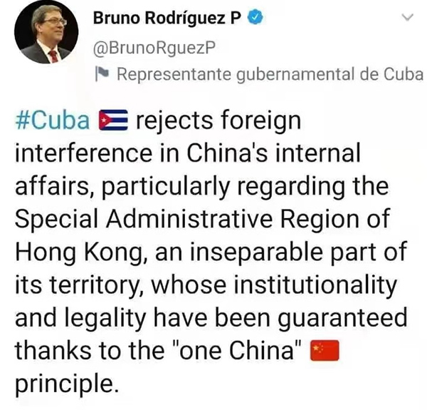 古巴外長羅德里格斯日前在社交媒體上發文說,古巴反對外國干涉中國內政,尤其是涉及香港特別行政區的事務。香港是中國領土不可分割的一部分。