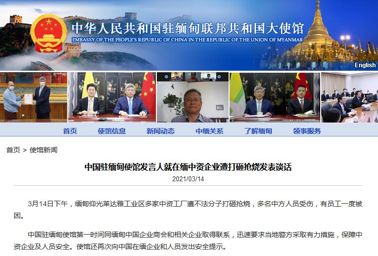 3月14日下午,緬甸仰光萊達雅工業區多家中資工廠遭不法分子打砸搶燒,多名中方人員受傷,有員工一度被困。