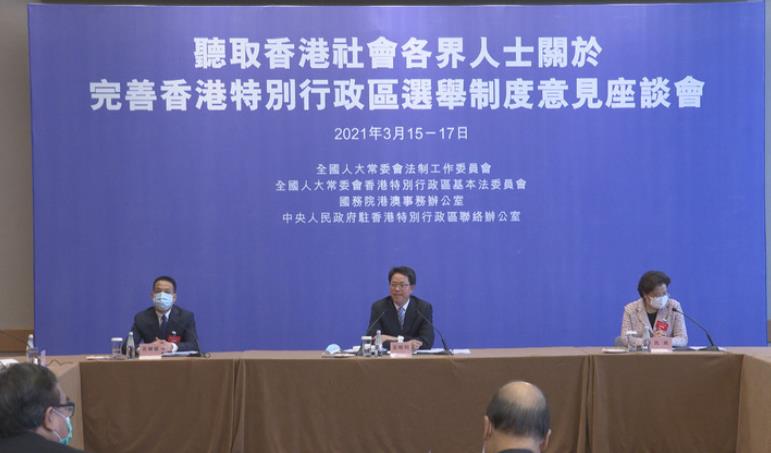 全國人大常委會法制工作委員會會同國務院港澳事務辦公室、中央人民政府駐香港特別行政區聯絡辦公室3月15日起連續3天在香港開展座談、訪談等活動,就落實全國人大關於完善香港特別行政區選舉制度的決定廣泛聽取逾千名香港特別行政區政府和香港社會各界代表人士的意見建議。