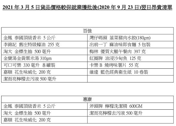 民建聯透露,「超市價格關注組」於2020年8月起選定21項貨品作持續監察,並對比超市成功申請第二期「保就業」翌日——2020年9月23日與2021年3月5日的數據,結果顯示百佳「價格指數」由622.8上升至628.7、惠康「價格指數」則維持在636.9。