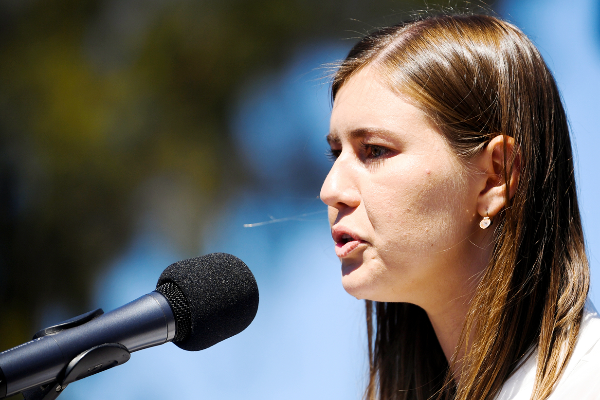 在澳洲國會內被強姦的自由黨前員工希金斯,昨天在坎培拉的「女性爭取公義遊行」集會上發表講話。路透社