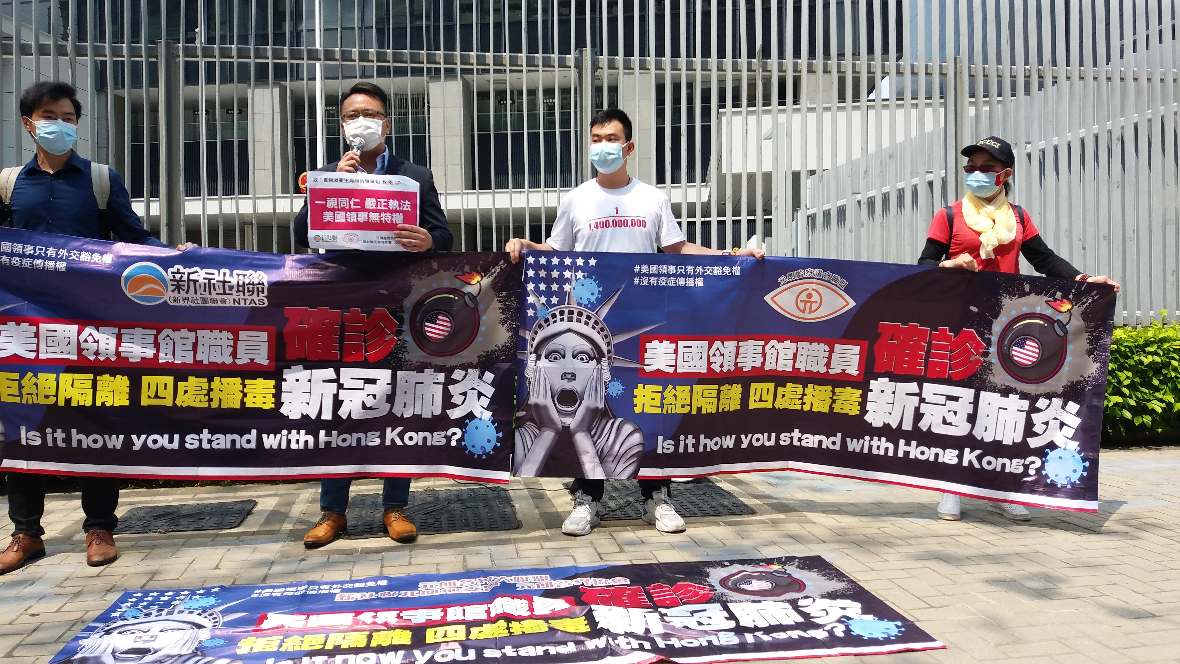 新社聯副理事長李世榮,社區幹事梁業鵬、林偉明、司徒駿軒表示,美國領事館職員不應以外交豁免權為藉口拒絕確診新冠肺炎人士隔離,他們並建議政府向外交部駐港特派員公署反映事件,讓對方與美國領事館進行交涉。