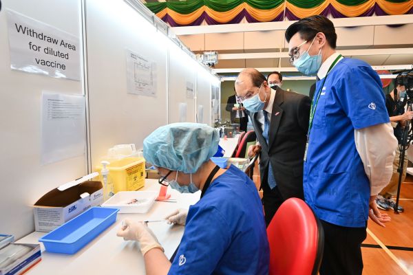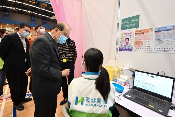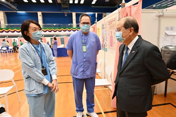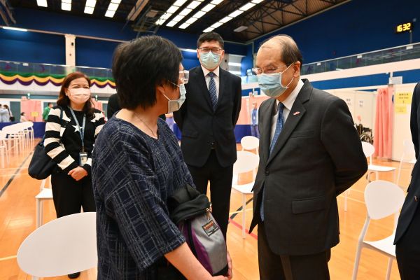 張建宗亦與在場接種疫苗的市民交談,並感謝他們參與疫苗接種計劃,協助控制疫情。