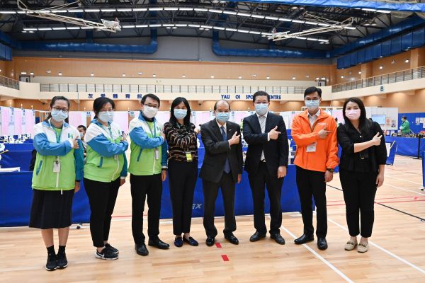 政務司司長張建宗今日(16日)到訪位於屯門友愛體育館和深水埗荔枝角公園體育館的社區疫苗接種中心,視察中心的運作情況,並為工作人員打氣。