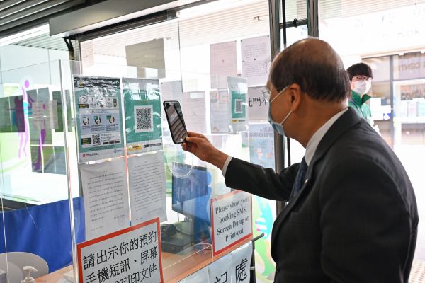 張建宗進入屯門友愛體育館的社區疫苗接種中心前掃描「安心出行」應用程式二維碼。
