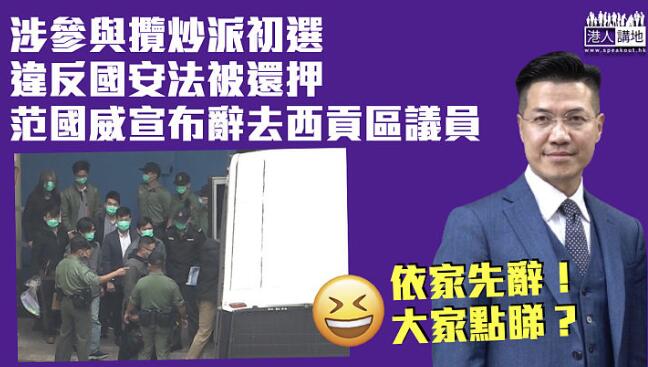新民主同盟創會會員、西貢區議員范國威在社交平台表示,正被還柙於荔枝角收押所,由於還柙期間無法履行議會職務,因此昨日辭任西貢區議員一職。