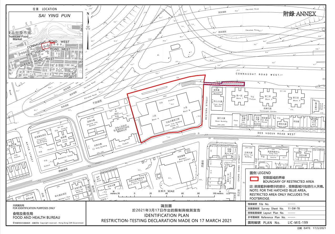 政府於今日(17日)晚上7時15分宣布引用《預防及控制疾病(對若干人士強制檢測)規例》(第599J章),作出限制與檢測宣告;政府指由下午7時15起將西營盤德輔道西271-285號均益大廈第三期列為「受限區域」,區內人士須在其處所等候,直至區內所有已識別受檢人士完成檢測,而相關檢測結果亦已獲大致確定,方可離開其處所。政府指目標是在明日(18日)上午約7時左右完成行動。受檢人士須於明日凌晨二時前接受檢測。