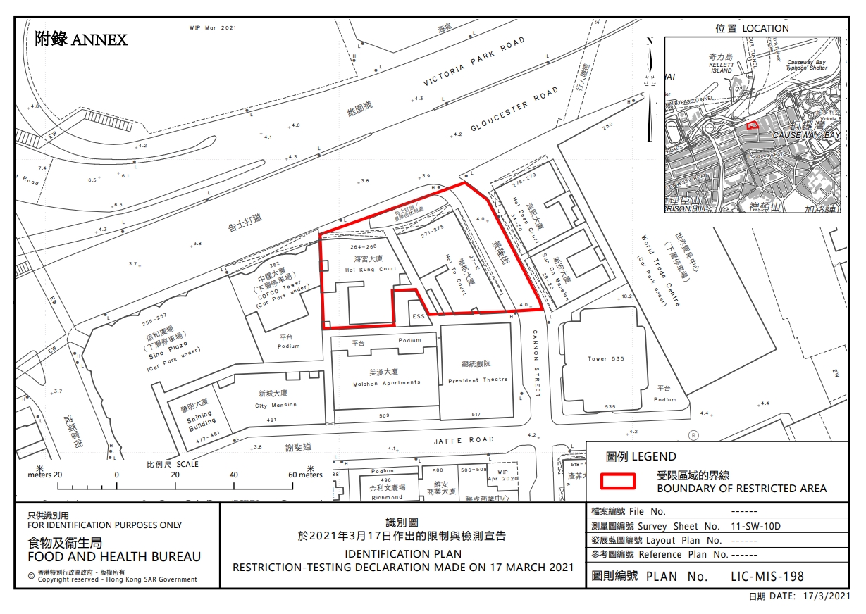 政府隨後宣布,自下午8時起限制在銅鑼灣告士打道264-268號海宮大廈和告士打道271-275號海都大廈內的人士接受強制檢測,受檢人士須於明日凌晨一時前接受檢測。政府目標是在明日(18日)上午約8時左右完成此行動。