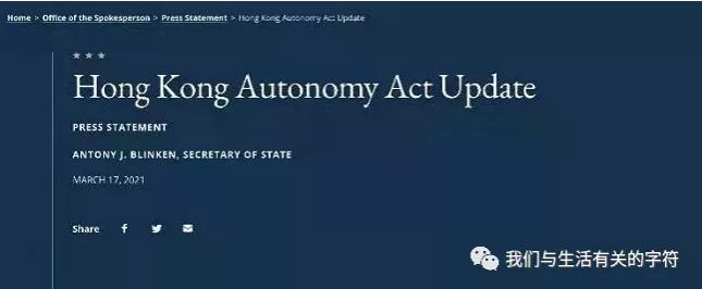 美國國務卿布林肯今日發布了一個所謂的《香港自治法》更新內容。