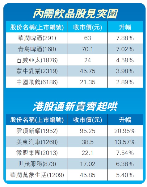 觀望美議息,恒指17日窄幅上落,最終收報29034點,升6點或0.02%,雖然三日累升294點或1%,但大市成交連續第三日少過2000億,再創逾1個月最低。科指收市報8574點,升43點或0.5%。內需飲品股見突圍,華潤啤酒(291)飆7.8%;百威亞太(1876)升4.5%;青島啤(168)升7.0%。