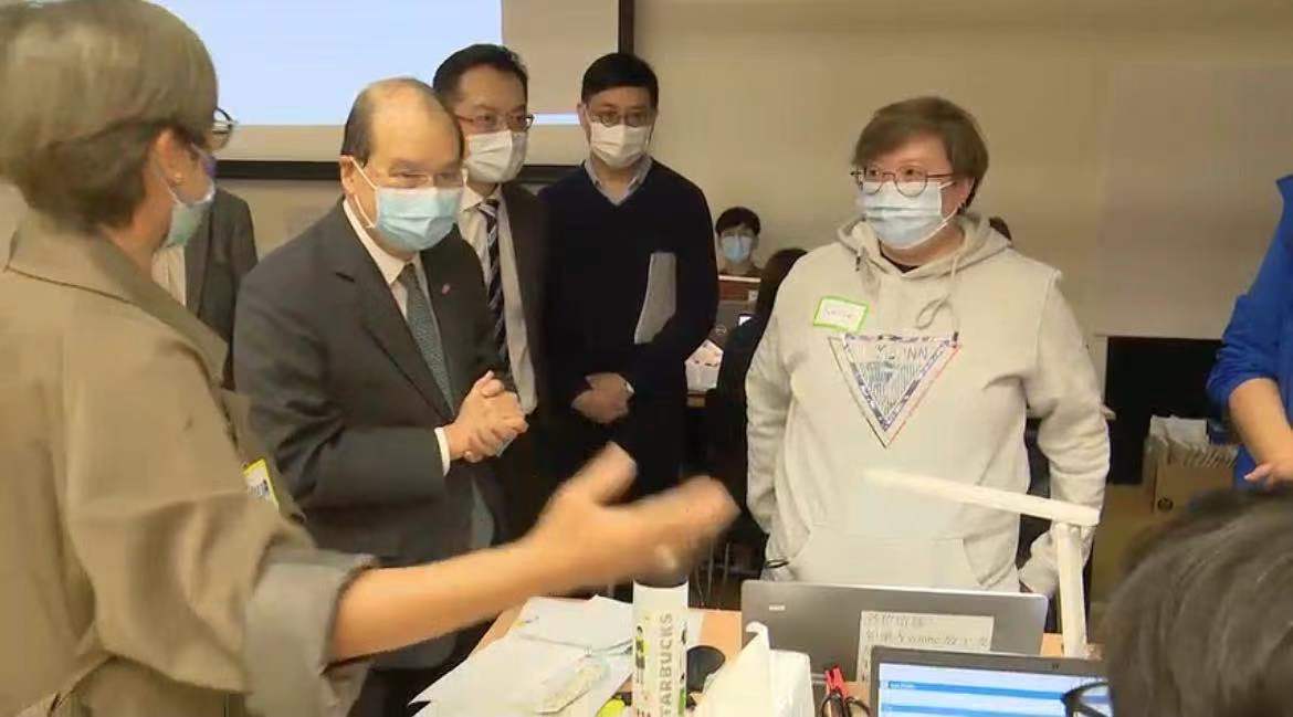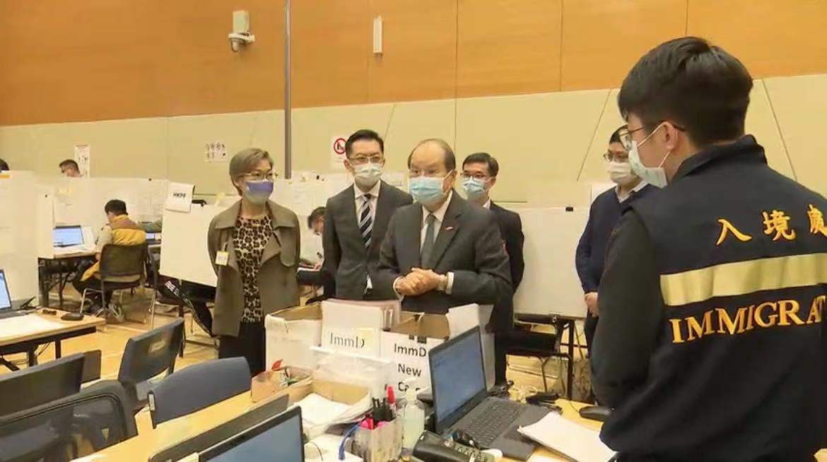 政務司司長張建宗今日(18日)視察設於啟德社區會堂的衞生署衞生防護中心個案追蹤辦公室,了解追蹤新冠肺炎確診個案接觸者的最新進展,並為工作人員打氣及肯定他們的努力。