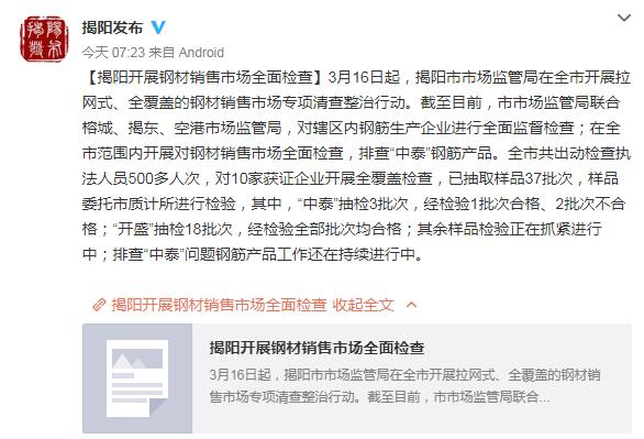 3月16日起,揭陽市市場監管局在全市開展拉網式、全覆蓋的鋼材銷售市場專項清查整治行動。截至目前,市市場監管局聯合榕城、揭東、空港市場監管局,對轄區內鋼筋生產企業進行全面監督檢查;在全市範圍內開展對鋼材銷售市場全面檢查,排查「中泰」鋼筋產品。全市共出動檢查執法人員500多人次,對10家獲證企業開展全覆蓋檢查,已抽取樣品37批次,樣品委託市質計所進行檢驗,其中,「中泰」抽檢3批次,經檢驗1批次合格、2批次不合格;「開盛」抽檢18批次,經檢驗全部批次均合格;其餘樣品檢驗正在抓緊進行中;排查「中泰」問題鋼筋產品工作還在持續進行中。