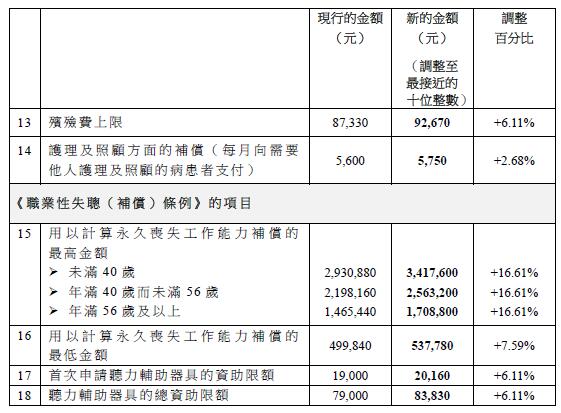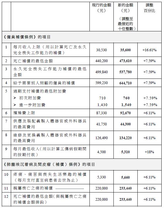 立法會于3月17日通過3項決議,包括調高《僱員補償條例》、《肺塵埃沉著病及間皮瘤(補償)條例》,以及《職業性失聰(補償)條例》,合共18個補償項目的金額。新修訂今日刊憲,並將於下月15日生效。隨着今次調整,3條條例共18個補償項目的金額將會調高,增幅介乎2.68%至18%。