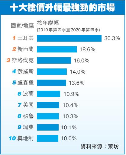 截至去年第4季,土耳其樓價按年增長30.3%,升幅為全球最高;新西蘭緊隨其後,樓價按年升18.6%,為亞太區表現最好的國家。