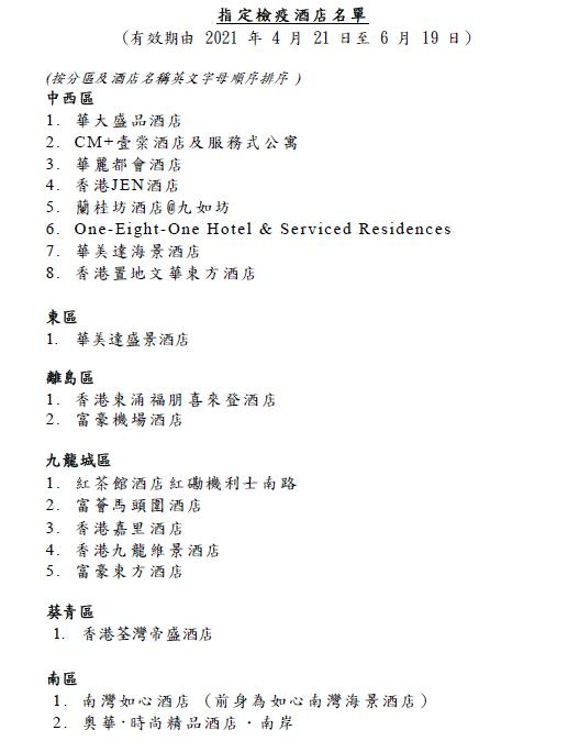 港府今日(19日)公布第三輪指定檢疫酒店的名單,新一輪酒店共30間,提供房間約8300間,合約期由4月21日起至6月19日。