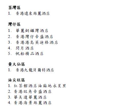 發言人指,經評估後,揀選共30間作為第三輪指定檢疫酒店,提供約8300間不同種類和價格的房間,供從中國以外地區抵港人士選擇入住。名單中有29間屬第二輪指定酒店,新加入的有一間。