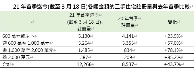 美聯物業首席分析師劉嘉輝指出,若與去年首季相比,本季迄今(截至3月18日)二手住宅註冊量及金額已分別高出約43.7%約56.9%,金額表現較宗數為佳,主要是受銀碼較大的個案的帶動。據資料顯示,逾2000萬元二手住宅註冊量錄387宗,按年急升約85.2%;逾1000萬至2000萬元錄1485宗,按年亦升約78.1%;逾600萬至1000萬元錄5264宗,按年升約57%;至於錄5130宗的600萬元或以下,亦較去年首季升約23.9%。由此可見,本季二手註冊個案的銀碼愈大,按年升幅亦愈大。