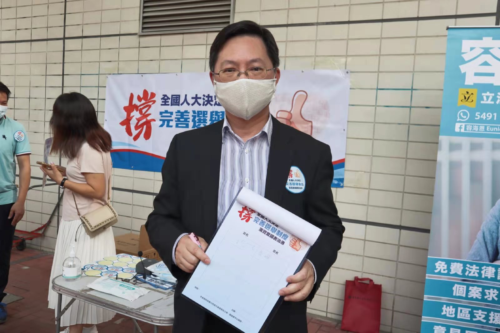 創新及科技局局長薛永恒今日(20日)下午到新民黨位於沙田沙角邨的街站,簽名支持全國人大通過完善香港選舉制度決定,呼籲市民簽名支持。現場反應十分熱烈。