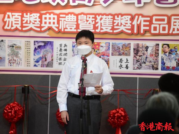 隨後,嘉賓逐一向得獎者頒獎,國畫小學組金獎是香港德望學校的朱子夢;書法中學組金獎是香港東華三院甲寅年總理中學的劉潤楷,他們均發表了獲獎感言和創作心得。(記者 李銘欣 圖片:崔俊良攝)