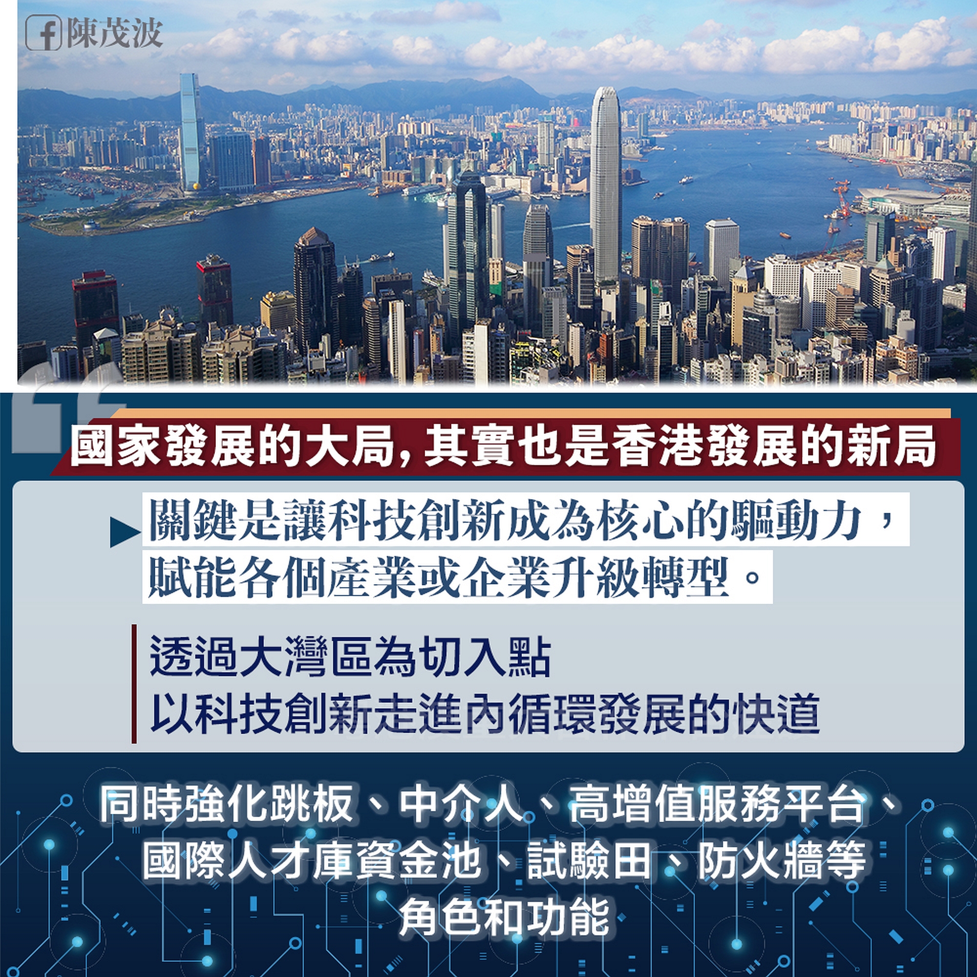 陳茂波又稱,「綱要」提到支持香港鞏固提升競爭優勢,包括第一次提到香港作為國際創新科技中心、國際航空樞紐等。此外,深港河套的科技創新合作區也首次被納入粵港澳重大合作平台建設,與大灣區內的前海、橫琴和南沙並肩。這些都關係到香港能否把握經濟增長的新動力,也涉及到經濟多元發展的續航力和更豐富的優質就業機會。