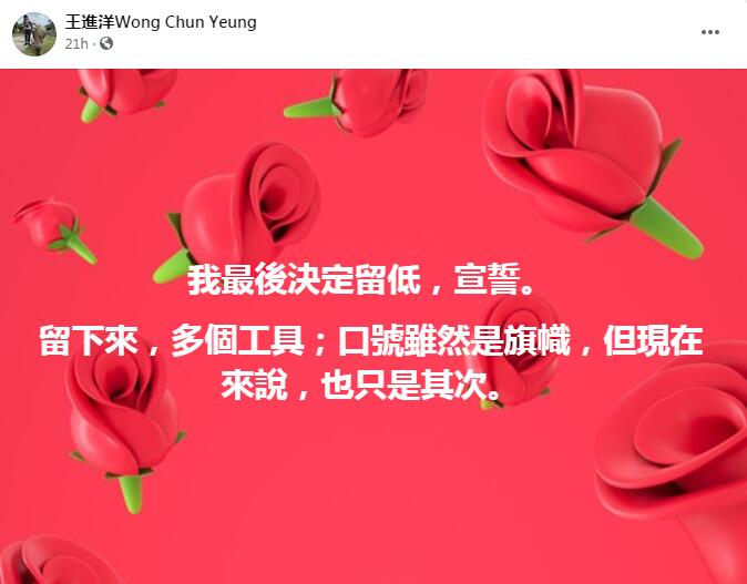 王進洋20日在社交網站宣布,「最後決定留低,宣誓」。為此他狡辯稱,留下是多一個工具,又說口號雖然是旗幟,但現時而言都只是其次。有「粉絲」留言直指「失望,unfollow(取消追蹤)」。亦有人說他只是笑話,批評他「生人霸死地」(類似俗語「佔著茅坑不拉屎」)。