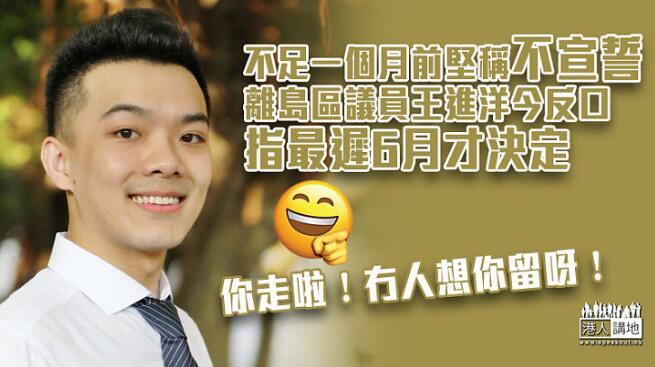 因應港府將要求所有現任區議員宣誓擁護《基本法》以及效忠香港特區,不少泛民主派區議員舉棋不定。離島區議員王進洋態度更是反反覆覆、屢轉口風。上月,他曾經宣稱將會辭職,之後又改口說「未必唔會宣誓」,昨日最新決定就改口稱:會留低宣誓!
