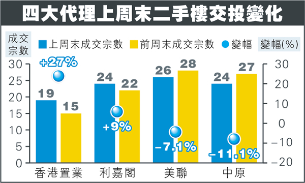 剛過去的周末,四大代理在二手樓交投上,有升有跌,表現最好是香港置業,上周末錄得19宗成交,按周上升27%,至於中原地產十大屋苑上周末則錄得24宗成交,雖較前周末回落11%,但仍企穩雙位數的活躍水平。