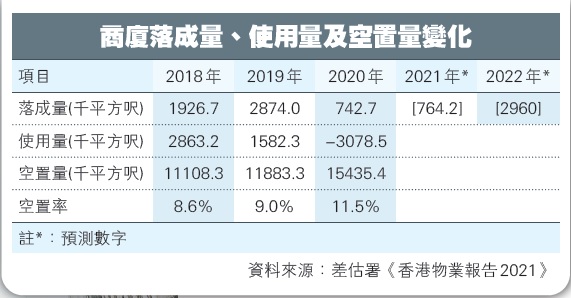 香港差餉物業估價署26日公布《香港物業報告2021》初步統計數字。截至去年底,本港商廈整體空置量上升至11.5%,創2004年有紀錄以來新高水平;空置樓面面積高達1543.5萬平方呎,按年急升30%。